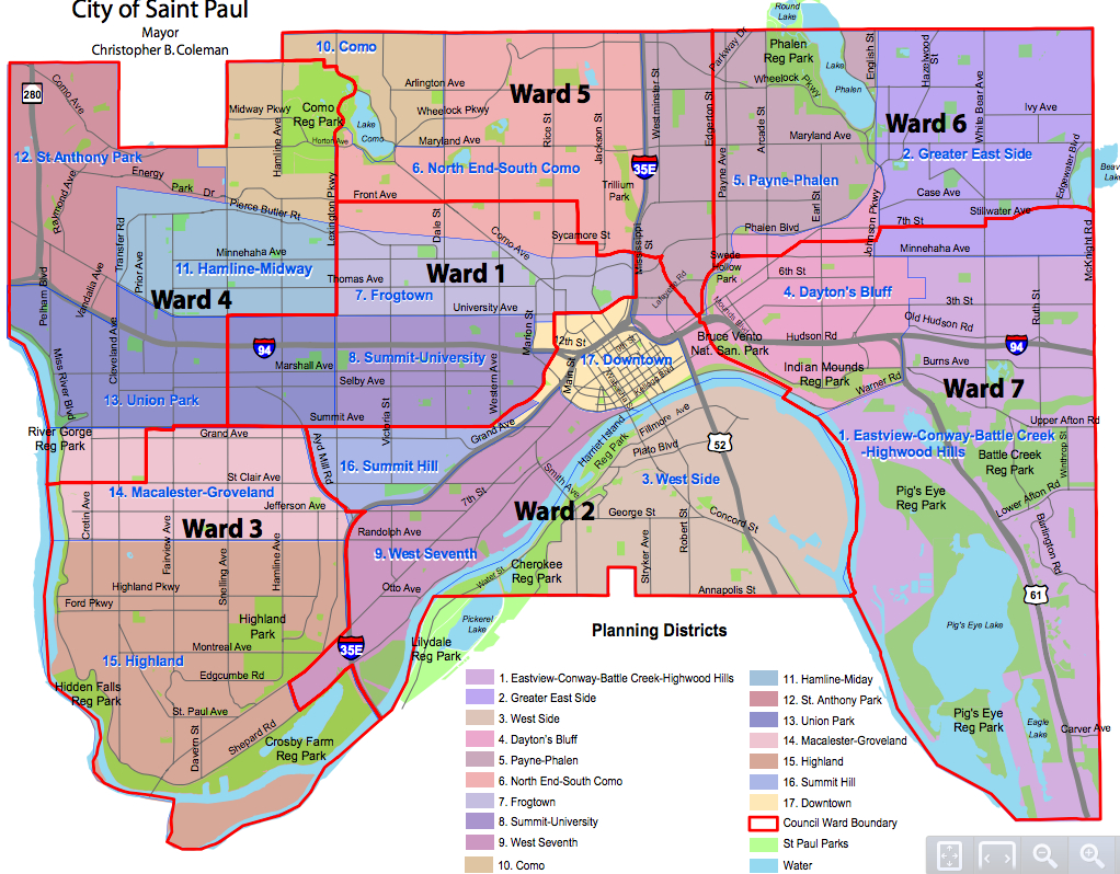 Here is a map of the district council and neighborhood names in St. Paul and the city council wards. Do you know who your *city council member is?
