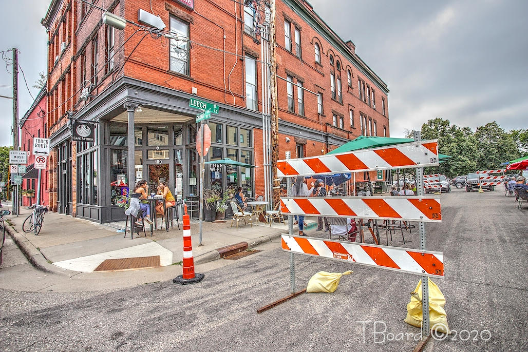 There are several restaurants and taprooms in the area that are open with outdoor seating using parts of parking lots and sidewalks.