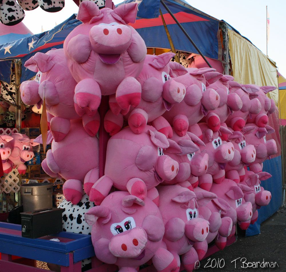 The giant stuffed pig is a popular midway prize this year. The barkers are out in full force encouraging people to put their money downplay the game and win the pig. Some people do actually win a pig. What would you do to win a pig?