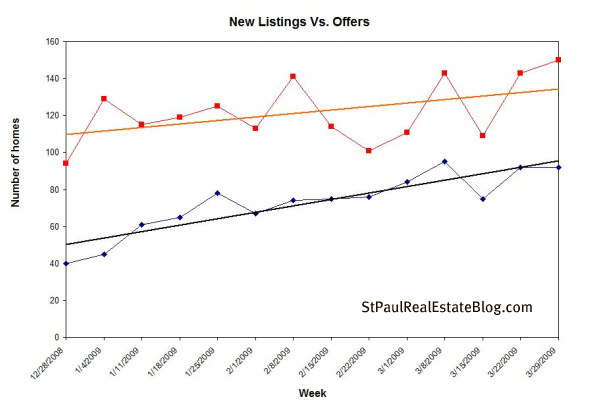 The red line on the chart above shows the number of homes that were listed for sale through the Regional Multiple Listing Service (MLS) each week since the beginning of the year. The blue line shows how many homes had offers made on them that were excepted by the sellers during the same week. Some of the homes have closed and some have not. Pending sales and listings are a metric used to measure the health of the real estate market. Real estate is local and these numbers are for St. Paul Minnesota. If you own real estate in St. Paul, or if you plan to buy this data is more useful than national numbers or numbers.